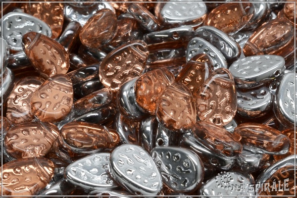 Korálek ve tvaru ploché kapky s nepravidelnými punítkovými prohlubněmi, rozměry 9x11 mm, tloušťka cca 3 mm. Čiré sklo, povrchová úprava vakuový spodní půlpokov Backlit Peach. Původ ČR - Rutkovsky. V balení 12 ks.