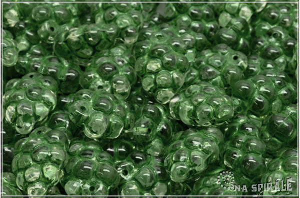 Korálek ve tvaru hroznů, transparentní čiré sklo s povrchovou úpravou Green Wash - zelený zátěr. Rozměry 16x11 mm, příčný průvlek v horní části. Původ ČR - Rutkovsky. V balení 6 ks.