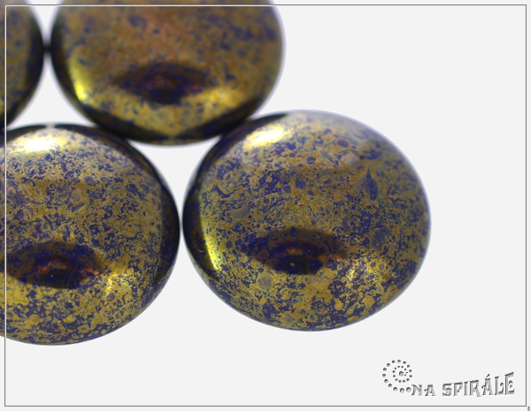 Kulatý bižuterní kámen (kabošon), ze skla s povrchovou úpravou - kobaltově modrý se zlatohnědým žilkováním. Průměr 25 mm, spodní část je plochá. Na obšívání kabošonů je ideální japonský rokajl TOHO, hodí se také na vlepování do lůžek. Vyrobeno v ČR. V balení 1 ks.