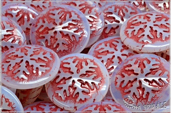 Kulatý bižuterní kámen (kabošon) ze světle ledově modrého opálového skla s vystouplým dekorem vločky a povrchovou úpravou Red Wash - červený zátěr. Průměr 21 mm, spodní část je plochá. Na obšívání kabošonů je ideální japonský rokajl TOHO, hodí se také na vlepování do lůžek. Vyrobeno v ČR, Rutkovský. V balení 1 ks.