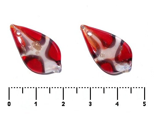 Skleněný přívěsek ve tvaru plochého lupínku s otvorem k zavěšení v horní části. Čiré sklo zdobené většími červenými skvrnami a zlatým avanturínem. Rozměry cca 25 x 15 mm, lupínky jsou velmi lehké, lze je použít jako náušnicové perle nebo přívěsky. Ruční práce, jednotlivé kusy se mohou mírně lišit tvarem i kresbou! V balení 1 ks.