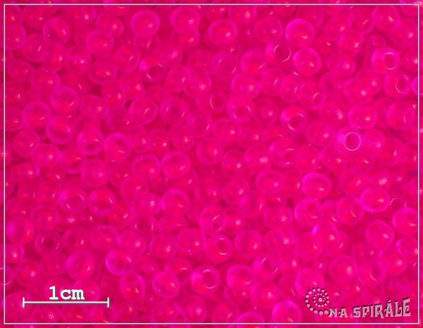 Čirý rokajl s matným povrchem a neonovou povrchovou úpravou svítivě růžové barvy, svítí pod UV světlem. Velikost 8, průměr cca 2,9 mm, tolerance velikostní odchýlky 2,8 až 3,2 mm.