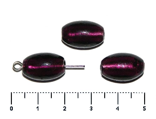 Korálek tvaru olivky z transparentního tmavě fialového skla, uvnitř stříbrná fólie. Ručně vinutá perle, délka cca 15 mm, průměr cca 10 mm. Ruční práce - jednotlivé kusy se mohou lišit. V balení 1 ks.