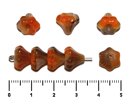 Korálky ve tvaru šesticípé kytičky-zvonečku se zaoblenými lupínky z žíhaného skla v hnědé a oranžové neprůhledné barvě. Podélný průvlek, délka ve směru průvleku 9 mm, šířka ve spodní části 10 mm. V balení 10 ks.