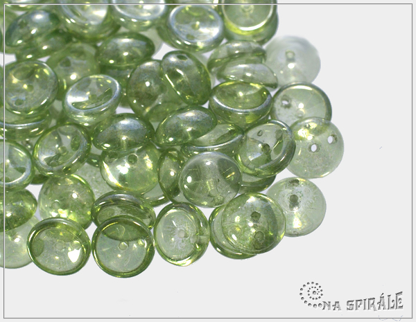Nová česká dvoudírková perlička Piggy Bead - prohnutá čočka připomínající prasečí rypáček. Průměr 8 m, výška korálku v nejvyšším bodu 4 mm, barva crystal pastel green luster - čirá se zeleným listrem. Korálky mají dvě dírky - jednu uprostřed a druhou umístěnou asymetricky u okraje - díky dvěma dírkám poskytují mnohem více možností použití. Vyrobeno v ČR. V sáčku cca 30 ks.
