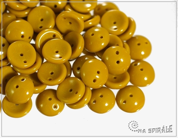 Nová česká dvoudírková perlička Piggy Bead - prohnutá čočka připomínající prasečí rypáček. Průměr 8 m, výška korálku v nejvyšším bodu 4 mm, hořčicová sytá barva. Korálky mají dvě dírky - jednu uprostřed a druhou umístěnou asymetricky u okraje - díky dvěma dírkám poskytují mnohem více možností použití. Vyrobeno v ČR.