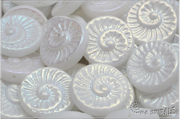 Korálky ve tvaru ploché spirály - amonitu - mušle (Fossil Shell). Rozměry 18x18 mm, barva bílá s povrchovou úpravou AB Full. Vyrobeno v ČR - Rutkovský. V balení 1 ks.
